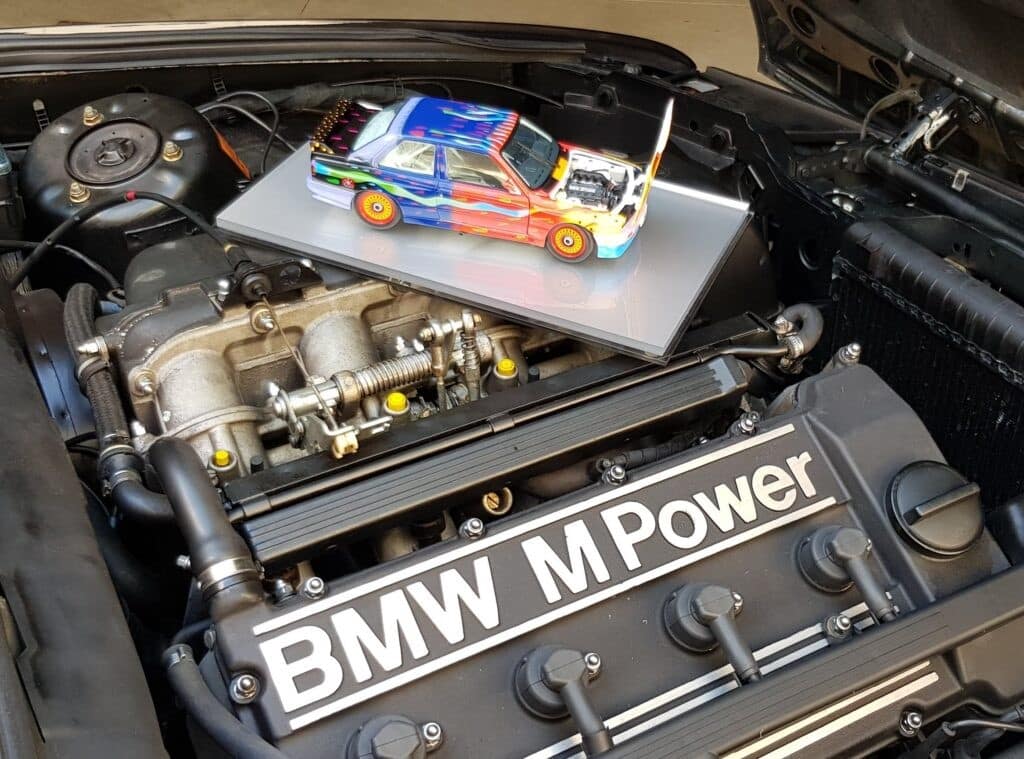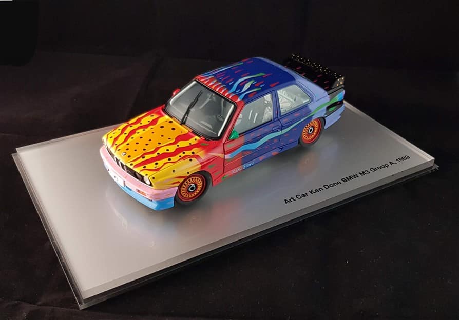 Note : artist signature under left door,prefect replicate in miniature. The M3 designed by Done is also from racing in Australia in black livery.The miniature perfectly replicates the bright colors and the touch of the Australian artist. Details such as the engine and fuel tank of this splendid classic BMW are faithfully reproduced.